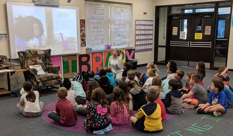 Each year the Amelia Island Book Festival hosts ‘Authors in Schools’ for 27 schools in Nassau County, Florida. They purchase books for each student K-12 in their county and arrange for authors to come and read their books. We were fortunate to read at Yulee Primary School to over 750 students, age 4 years through 2nd grade. Each child received a copy of DLIMH!2, our goody bag, and dinosaur coloring sheets. Heather and I presented twenty-one times over the period of four days and loved every minute of it!